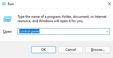 1. กดปุ่ม Windows+R พิมพ์ข้อความว่า Control panel ตามภาพ