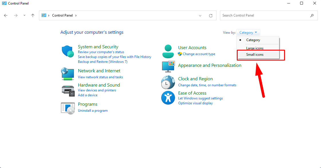 2. เลือกหมวดหมู่ดังภาพ Category เปลี่ยนเป็น Small icons