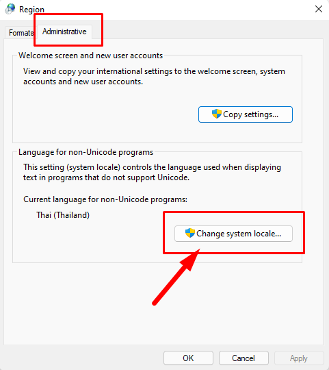 5. คลิ๊กมาที่ Adminstrative -> คลิ๊ก ปุ่ม Change system locale...